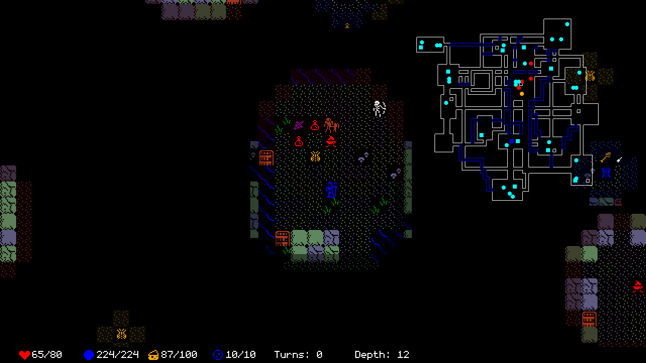 I added a mini-map inspired by the Mystery Dungeon series. It shows the player, water corridors, items, chests, nearby enemies, and the exit stairs. The map gradually reveals itself as the player explores the dungeon.
